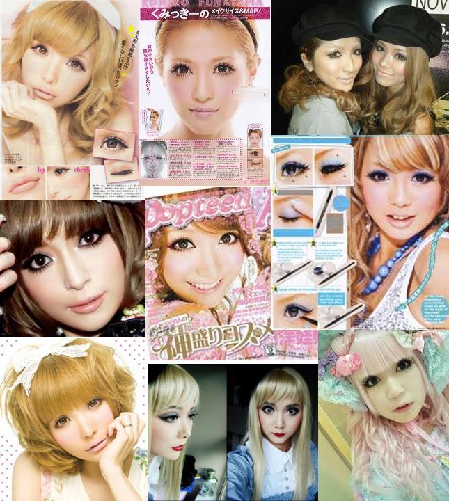 Started mostly in Japan and probably first pioneered by J-pop queen Ayumi Hamasaki , the human doll "Kawaii" look is fast catching up everywhere and you're seeing more and more girls sporting the contact lens with huge iris circumference, exaggerated eyeliner, thick wads of faux eyelashes and pale porcelain skin that looks almost pore-free. Oh of course that super kawaii pouffy hair with big bow and baby bangs that make them look like a delicate porcelain doll.